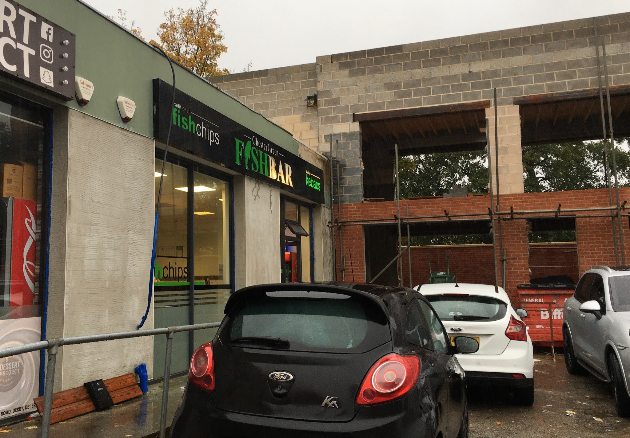 The first thing that struck us about Chester Green Fish Bar was the green sign that reminded us ever so of Steve’s at Alvaston. Right down to the jumping fish of the letter ‘i’.