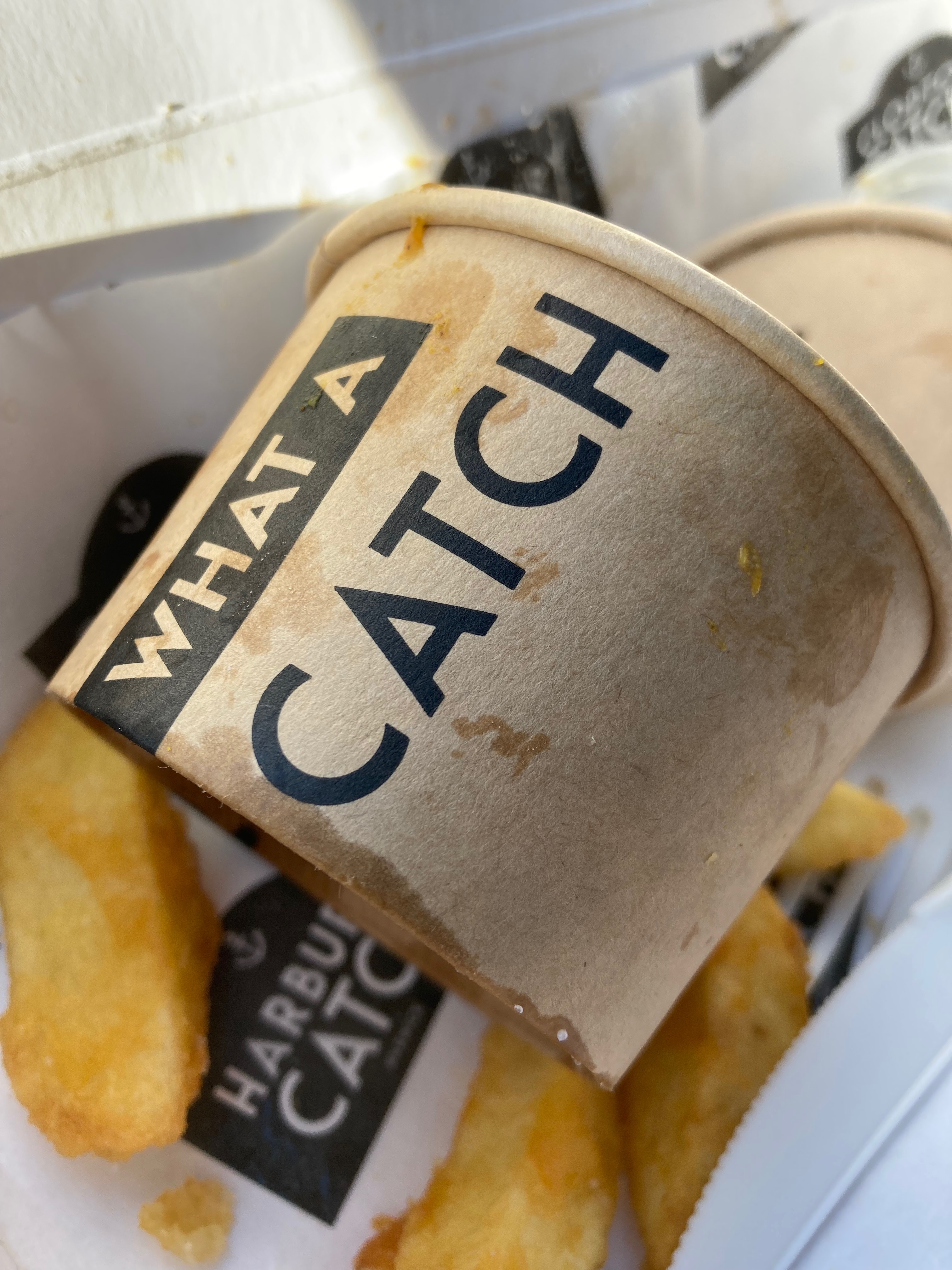 When we unboxed the food we had a wonderful surprise! The chips were battered! We hadn’t expected that at all. It was a thin coating of batter which made the chips delicately crisp. They had a medium thickness and were nice and fluffy inside.